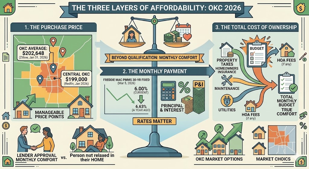 For buyers in OKC, that combination creates a mixed picture. Home prices have not exploded the way they did in many larger cities, but monthly payments are still being shaped heavily by interest rates. That means affordability today is less about just the sale price and more about the full monthly payment, including principal, interest, taxes, insurance, and any HOA costs. Zillow’s affordability guidance also notes that income, monthly debt, down payment, and interest rate are the biggest drivers of what a buyer can comfortably afford.