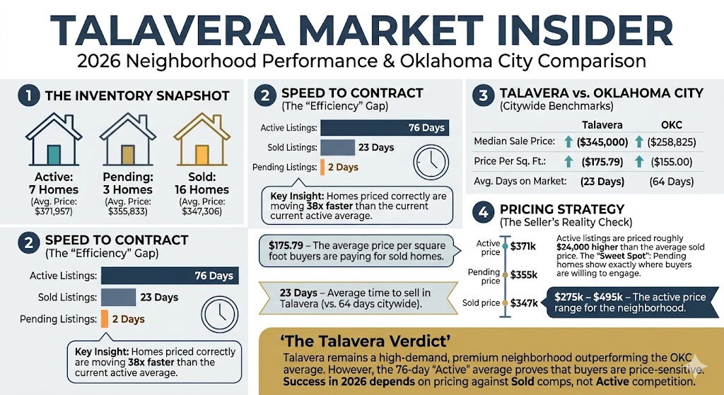 At the same time, Talavera’s recently sold homes are moving faster than the broader Oklahoma City market on average. The CMA shows Talavera sold listings averaging 23 days on market, compared with waht reports show a 64-day citywide median. That suggests Talavera has been outperforming the broader market in buyer response when homes are priced correctly and presented well. Because one figure is a neighborhood average and the other is a citywide median from a separate source, it is not a perfect apples-to-apples comparison, but it still points in the same direction: Talavera’s recent sold inventory has shown stronger-than-average market speed.