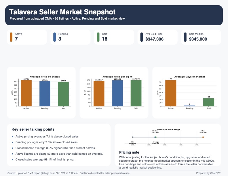 For sellers, the biggest takeaway is that Talavera has proven demand, but that demand is tied to positioning. In this CMA, sold homes averaged $175.79 per square foot, while active listings averaged $169.17 per square foot. That may seem counterintuitive at first, but it suggests some current actives may be larger homes, less updated homes, or simply listings that have not yet matched the strongest pricing and condition sweet spot that recent buyers rewarded.